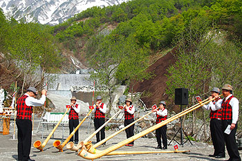 ![]() 宿のオーナーは「白馬アルプホルンの会」のメンバー。アルプホルンは先生の指導の下、間伐材を利用して自分たちで作ったもので、グリーンシーズンはイベントなどで演奏することも。 山をバックにするのが映えます。 |